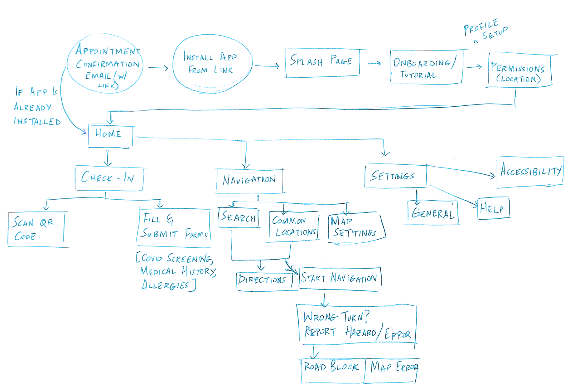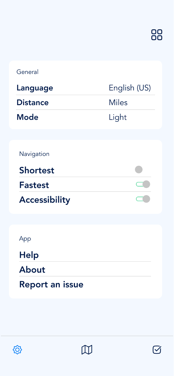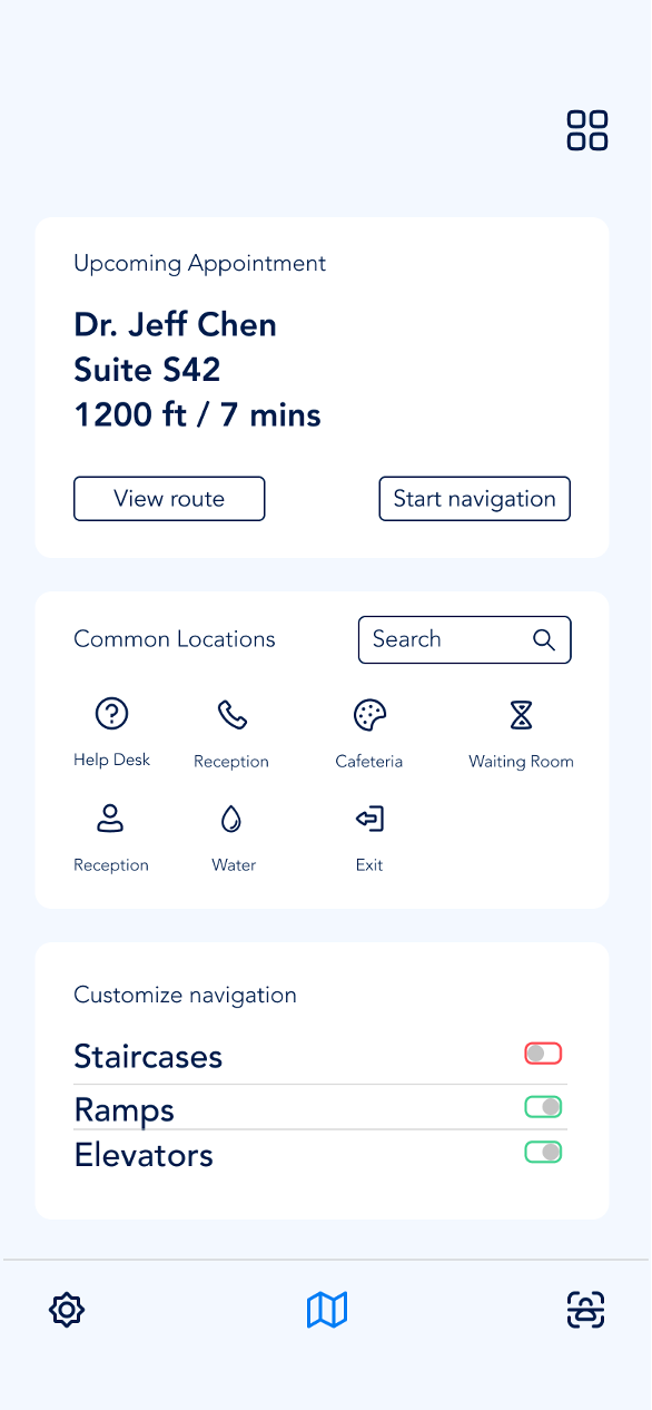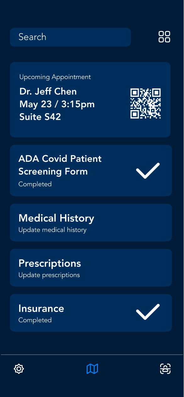The app’s initial design involves a navigation of three choices: a check-in pane that lets users scan their QR code and fill requisite forms, a navigation pane that allows user to view and customize their routes and a settings pane.